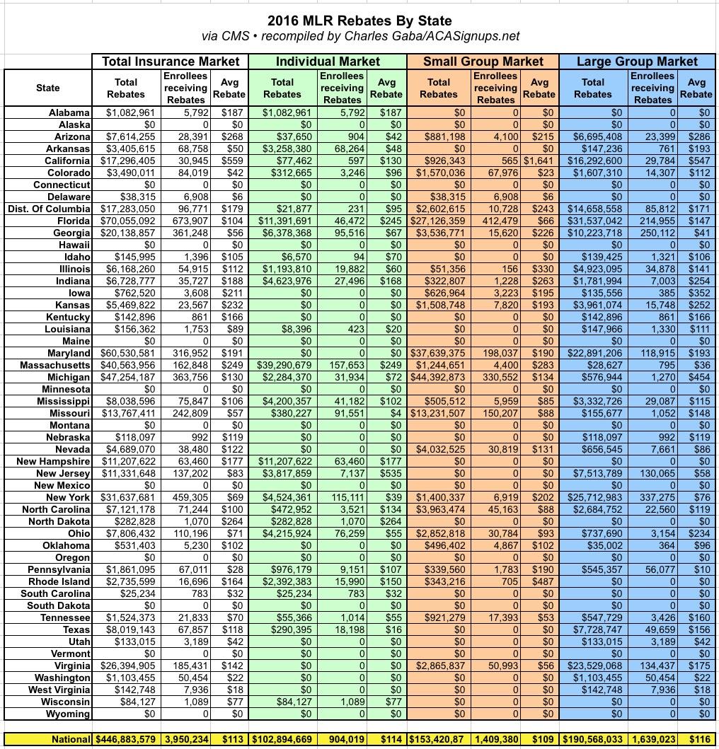 In any event, the Centers for Medicare & Medicaid (CMS) recently issued their latest annual report, confirming that around 900,000 individual market enrollees (roughly 5% of the total indy market, or 6% of the ACA-compliant market) received an average of $114 apiece thanks ot the ACA's MLR rule, for a total of about $103 million nationally.