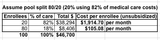 80 people out of 100 are only paying $105/month, which is still quite a bargain...but the unsubsidized cost for the other 20 is now $1,915/month, or nearly $23,000/year. Again, the tax credits would cover most of that for anyone below 400% FPL, but anyone above that income threshold is utterly screwed: