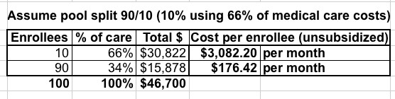 Let's say that you have 100 people currently using an average of $467/month in healthcare services (for the moment, I'm ignoring profit margins and the like). That's a total of $46,700 per month for all 100 people.