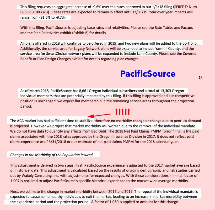 Note, by the way, that PacificSource specifically states that "the ACA market has had sufficient time to stabilize"....and that effectively the only significant factor driving up rates is repeal of the individual mandate. Since PacificSource is even dropping their rates by 9.6%, that means if not for mandate repeal, they'd be dropping their rates even more.