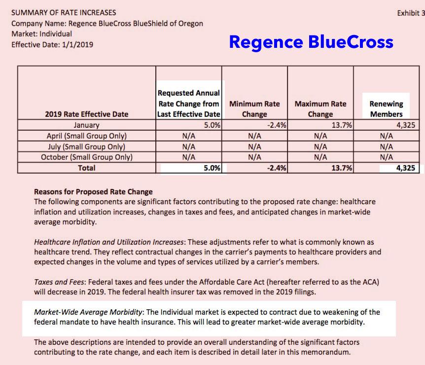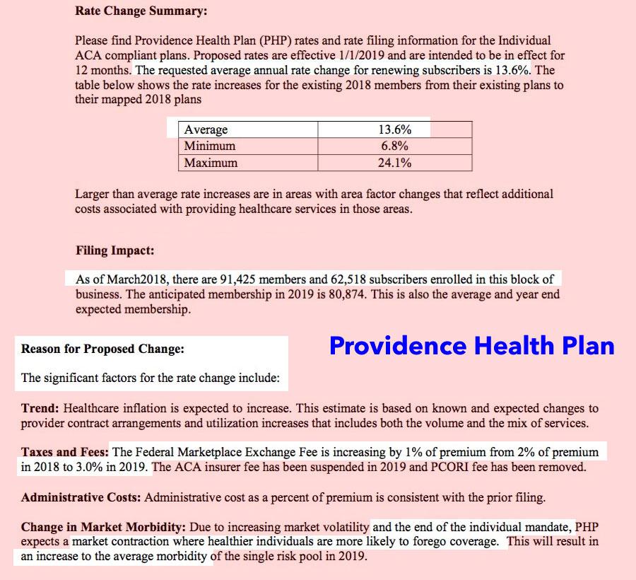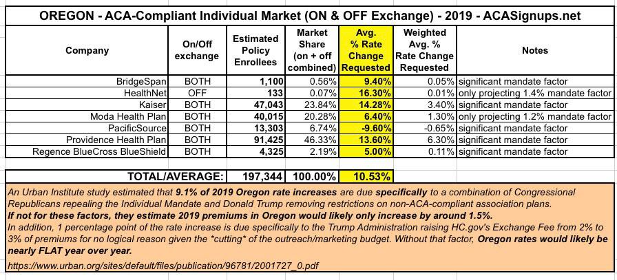 Oregon: Preliminary 2019 ACA rate hike request: 10.5% (likely ~1.4% w/out mandate repeal)