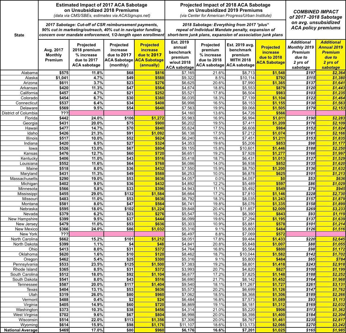 Then, this morning, the Center for American Progress (CAP), using projection data from the Urban Institute (and very much confirmed by similar projections from the Congressional Budget Office, the Society of Actuaries and the Chief Actuary for the HHS Dept.) posted a new analysis projecting the expected impact of 2018 sabotage efforts by Donald Trump and Congressional Republicans on unsubsidized 2019 premiums.