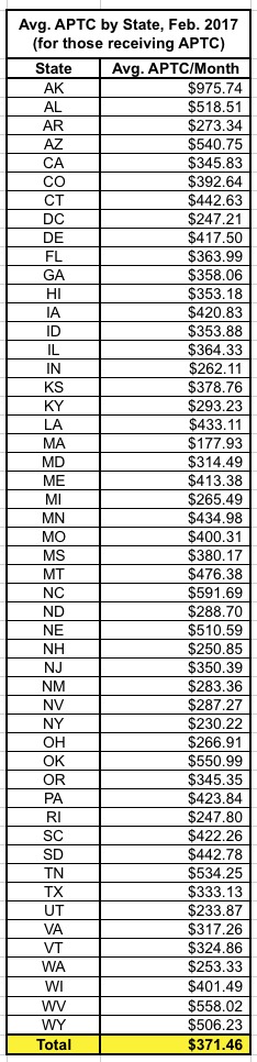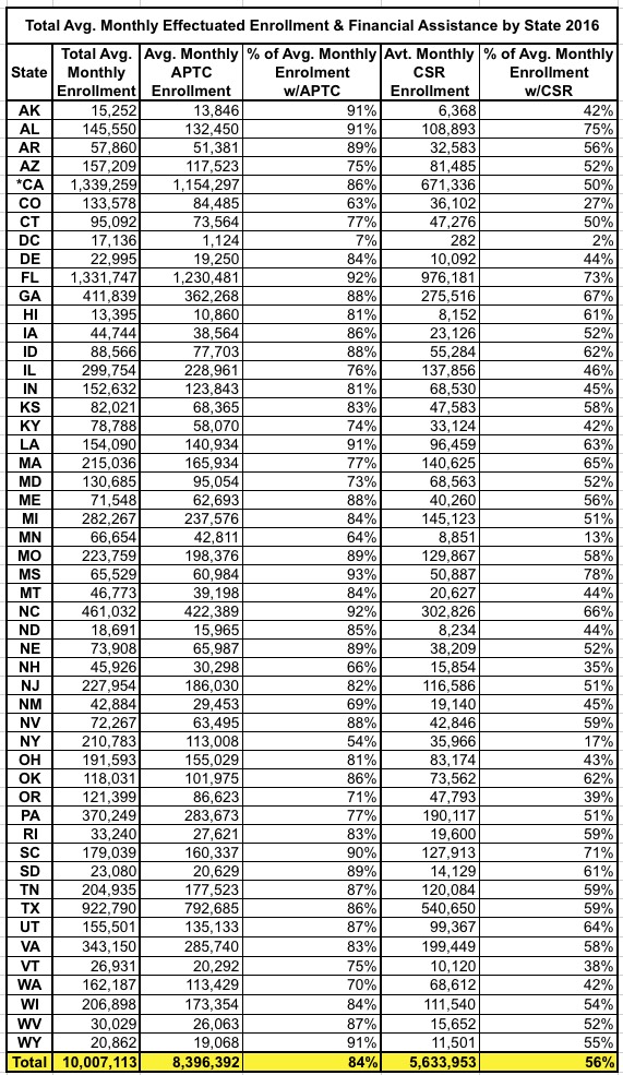 2016 average monthly APTC enrollment is the average number of unique individuals who had an active policy in 2016, who had paid their premium (thus becoming effectuated), and who received an APTC subsidy. APTC is generally available if a consumer's household income is between 100 and 400 percent of the federal poverty level, and certain other eligibility criteria are met. The average monthly number of effectuated enrollments was calculated by total member months divided by 12.