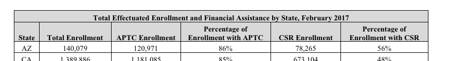 This report also shows that the proportion of the population that enrolls on Federal and State-Based Exchanges and qualifies for financial assistance in the form of advance premium tax credits (APTC) or cost-sharing reduction (CSR) has remained relatively stable. However, the average amount of APTC per eligible enrollee has risen 28 percent when compared with the 2016 average APTC per eligible enrollee. 1
