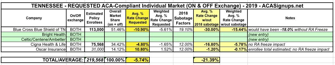 Remember, the RA thing is on top of the other big sabotage factors this year: Repeal of the ACA's individual mandate and the expansion of #ShortAssPlans. Those are, as usual, specifically called out by most of the TN carriers as well. None of them break the impact out specifically, so I'm once again using my standard estimate: 2/3 of what the Urban Institute projected these factors to be. In the case of Tennessee, Urban estimated around 18.1 percentage points would be tacked on, so I'm assuming this to be around 12 points to err on the side of caution.