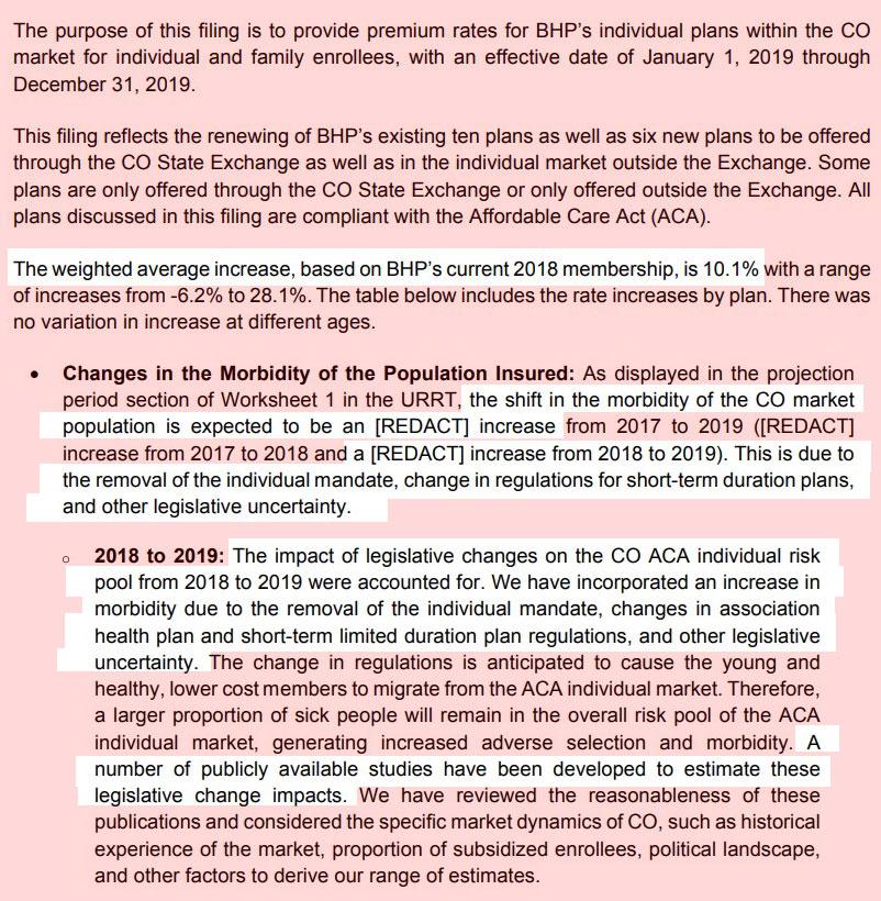 As you can see below, I don't have the hard enrollment numbers for some of the carriers, but the state insurance division has already done the weighted average calculation for me (5.94%). Several of the carriers specified how much they're raising rates due specifically to mandate repeal and/or #ShortAssPlans being expanded (10 points for HMO Colorado/Anthem and Rocky Mountain HMO, just 3.7 points for Friday Health Plans). The others didn't specify the impact, but most do mention it as a significant factor on rate hikes.