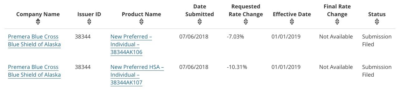 Unfortunately, some carriers submit multiple filings for different lines of business even if they both use the same "Actuarial Memorandum" to justify the incresae...and often times the memo itself is redacted, with the critical data (covered lives, percent increases, dollar amounts, etc.) blocked out, making it kind of useless for my purposes. Such is the case with Premera Blue Cross Blue Shield, the sole ACA market carrier in Alaska. Thanks in large part to the state's successful reinsurance program, they're dropping rates by 7% on most of their policies, and by 10.3% on the rest...but I don't know the relative portion of each, so I can't be sure what the weighted average of the two is. The second listing is for Health Savings Account plans only, so I'm assuming the bulk of their enrollees have the first types of policies, which suggests roughly an 8% overall premium drop.
