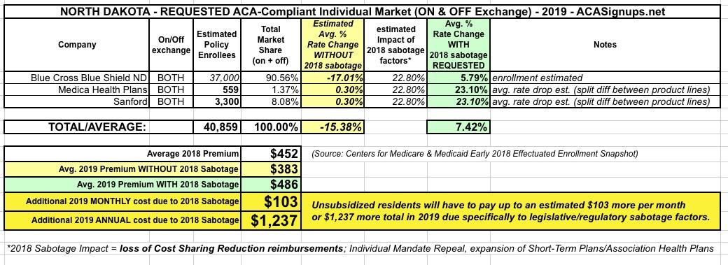 North Dakota: Preliminary 2019 ACA rate hikes: 7.4% INCREASE instead of ~15.4% DECREASE due to #ACASabotage