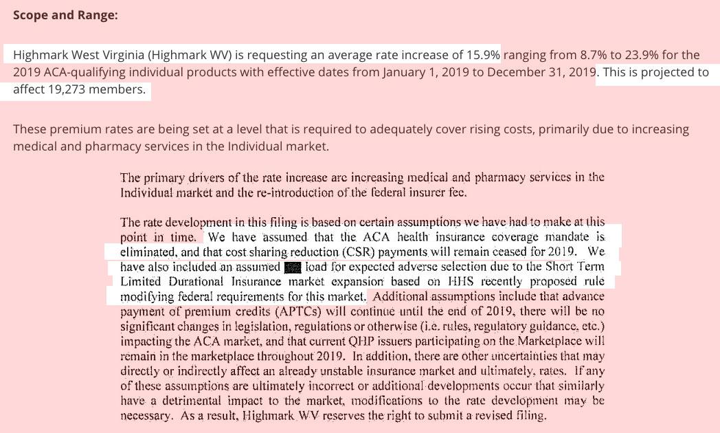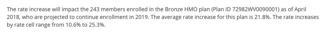 West Virginia: Preliminary 2019 #ACA rate hikes: 14.9%; would have been closer to 2% without #ACASabotage