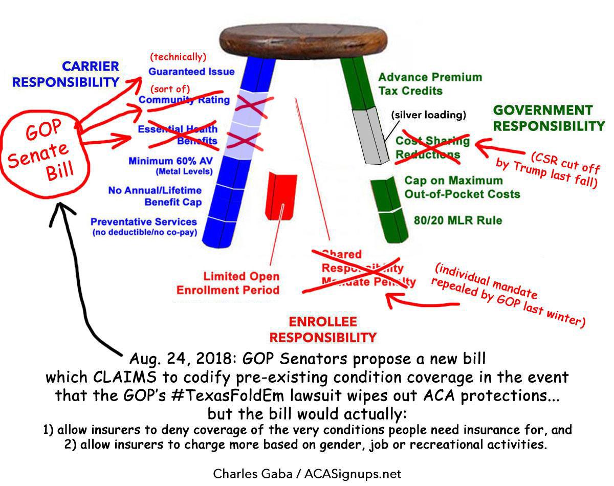 In response, Republican Senators Tillis, Alexander, Grassley, Ernst, Murkowski, Cassidy, Wicker, Graham, Heller and Barrasso have introduced a new bill which they claim would ensure pre-existing coverage protections. Unfortunately, it...doesn't.