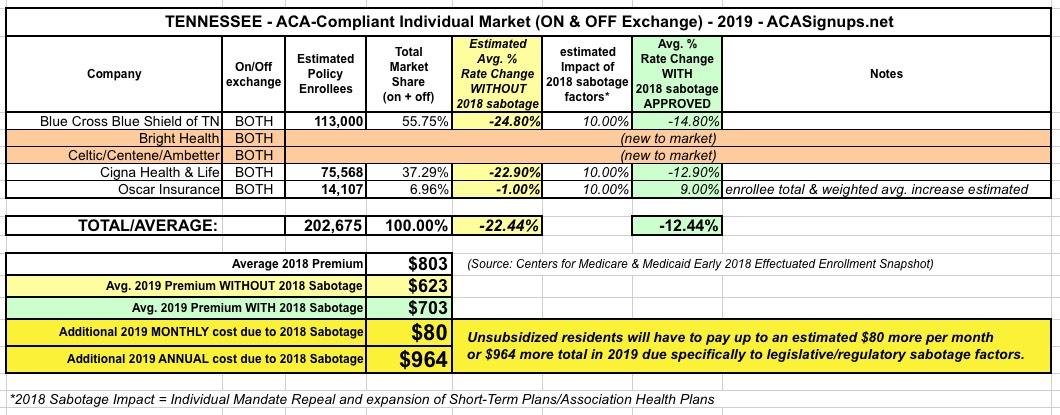 Unsubsidized enrollees are paying around $803/month on average in Tennessee this year. a 10% sabotage impact means that they're paying $80 more than they would otherwise, or around $960 more apiece for all of 2019.