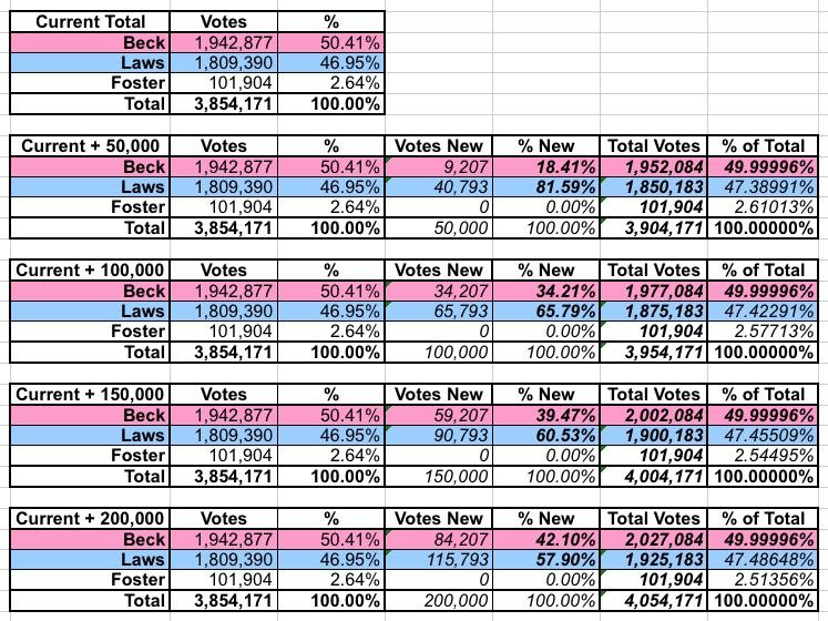 There would have to be nearly 50,000 more votes added for there to be any chance of a run-off, and Laws would have to win over 80% of those. At 100,000 additional votes, she'd have to take 2/3 of them, and if 200,000 more are added, she'd still have to win nearly 58% of the total. Still, anything is possible...
