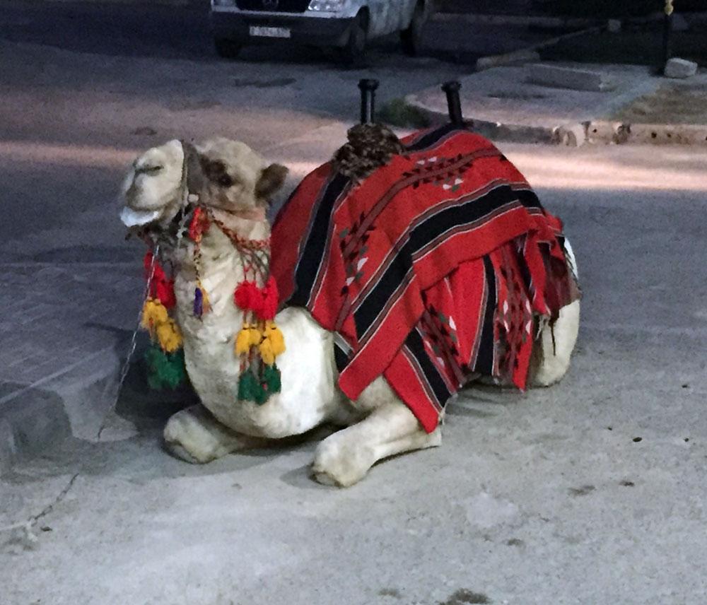 A camel chilling outside a convenience store