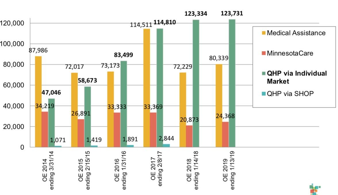 Here's a chart showing the total annual enrollment in each of the 4 types of coverage offered via MNsure: Medicaid ("Medical Assistance"), MinnesotaCare (MN's BHP program); Individual market QHPs and SHOP (small business) QHPs. The first two categories are actually misleading because both Medicaid and MinnesotaCare can be enrolled in via other means as well.