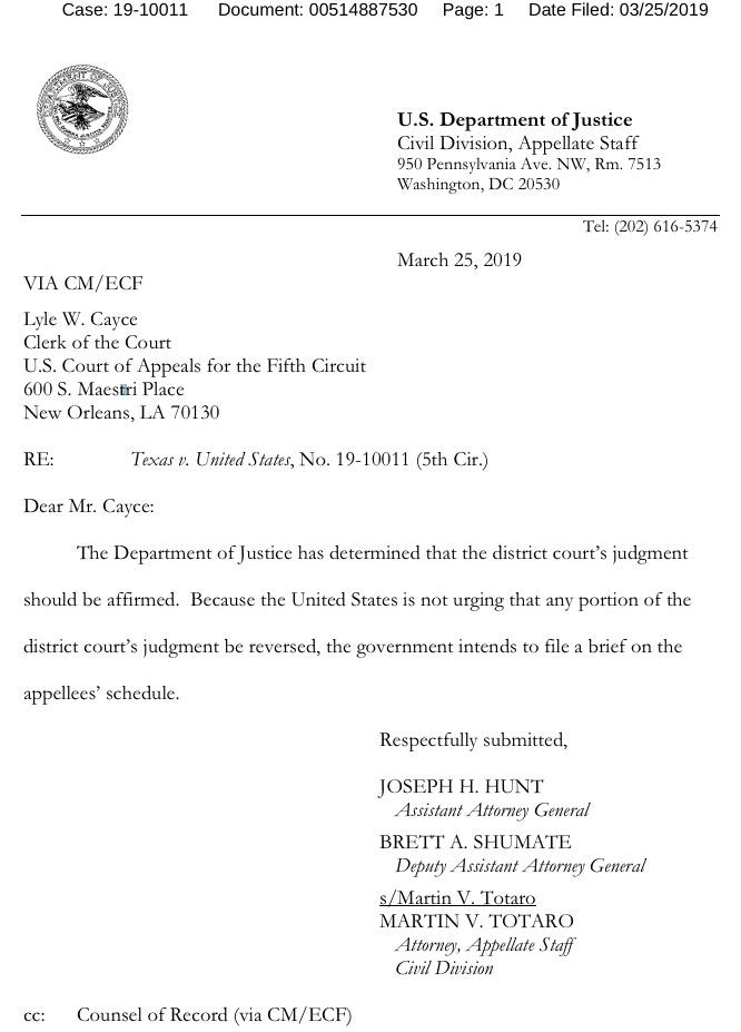 In a stunning, two-sentence letter submitted to the Fifth Circuit today, the Justice Department announced that it now thinks the entire Affordable Care Act should be enjoined. That’s an even more extreme position than the one it advanced at the district court in Texas v. Azar, when it argued that the court should “only” zero out the protections for people with preexisting conditions.
