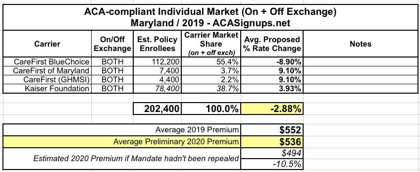 In any event, assuming the preliminary rate changes are approved as is, I'd expect 2020 ACA exchange policies to average around $536/month.