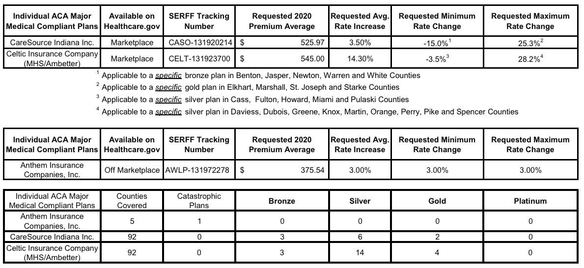 The overall average rate increase for 2020 Indiana individual marketplace plans is 9.0%. CareSource and Celtic (MHS/Ambetter) have filed to participate in the 2020 Indiana Individual Marketplace. The Department of Insurance anticipates that all 92 counties in Indiana will be covered by both CareSource and Celtic (MHS/Ambetter).