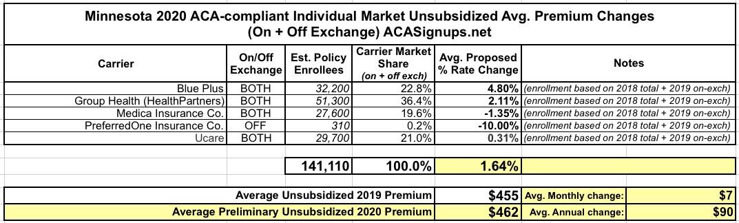 Minnesota: PRELIMINARY 2020 ACA Exchange Premium Rate Changes: 1.6% increase