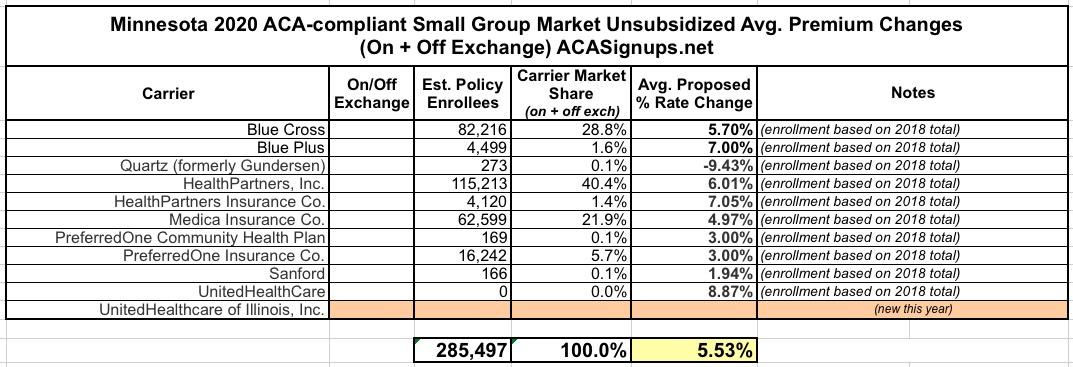 The Minnesota Commerce Dept. just posted their preliminary 2020 Individual and Small Group rate changes. The actual rate changes are pretty straightforward...a mere 1.6% average rate increase on the ACA Individual Market, and a 5.5% increase on the Small Group market.