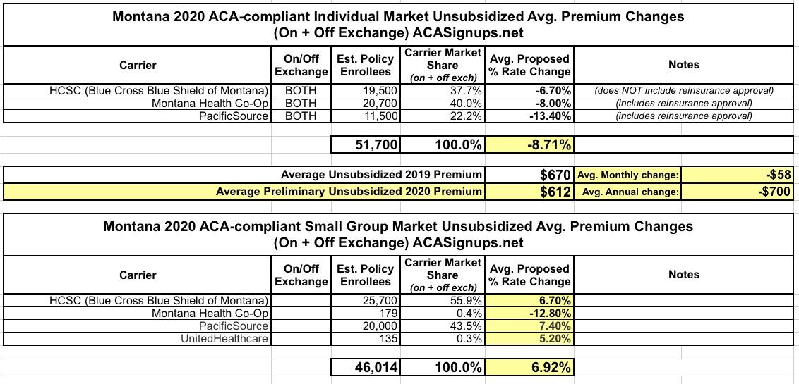 Montana: PRELIMINARY 2020 ACA Exchange Premium Rate Changes: 8.7% *decrease*