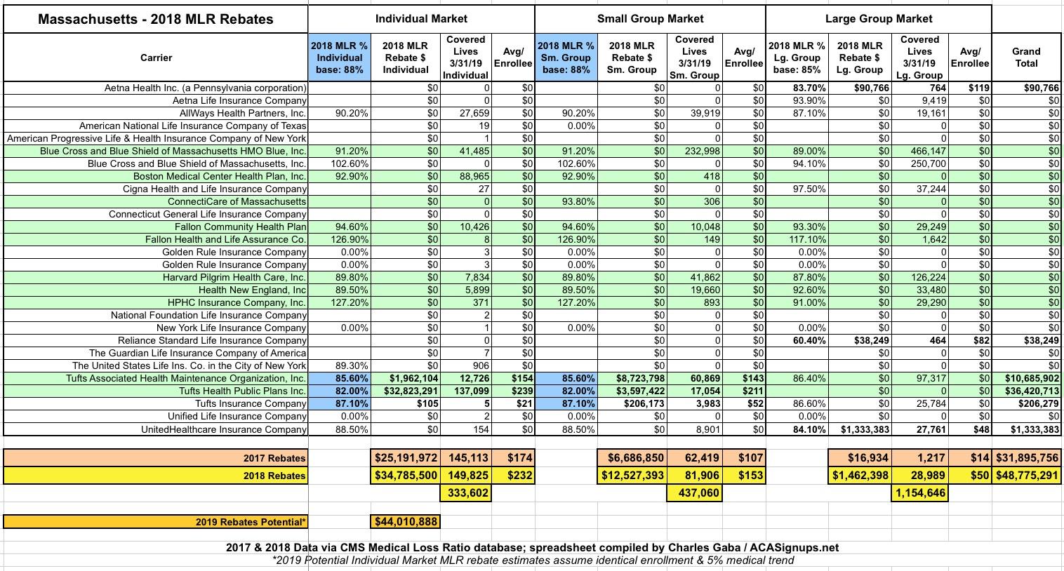 In other words, apparently up until 2012, Massachusetts set their MLR threshold at  90%, though they knocked it down 2 points since then. This is still a full 8 points higher than the federal threshold for the indy & small group markets...and as you can see above, this makes a huge difference: All $47.3 million of the 2018 Individual/Small Group market rebates is courtesy of that 8-point difference. If Massachusetts followed the same 80% cut-off as other states, enrollees would never see any of that money.