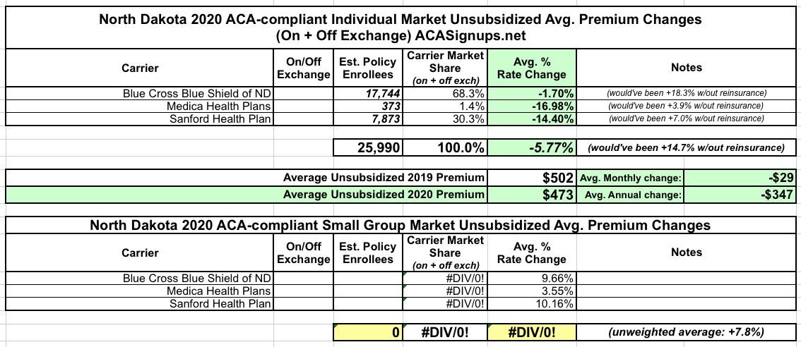 At the time, I didn't have access to the actual enrollment figures for the three carriers on North Dakota's individual market, so I had to go with an unweighted average rate change, and came up with a drop of 7.9%.