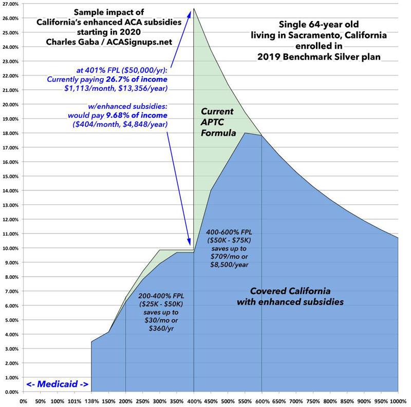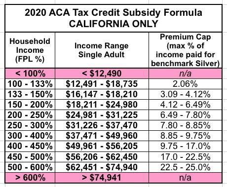 1. Until now, only CoveredCA enrollees earning 138-400% of the Federal Poverty Line were eligible for ACA financial assistance. Starting in 2020, however, enrollees earning 400-600% FPL may be eligible as well (around $50K - $75K/year if you're single, or $100K - $150K for a family of four). In addition, those earning 200-400% FPL will see their ACA subsidies enhanced a bit.