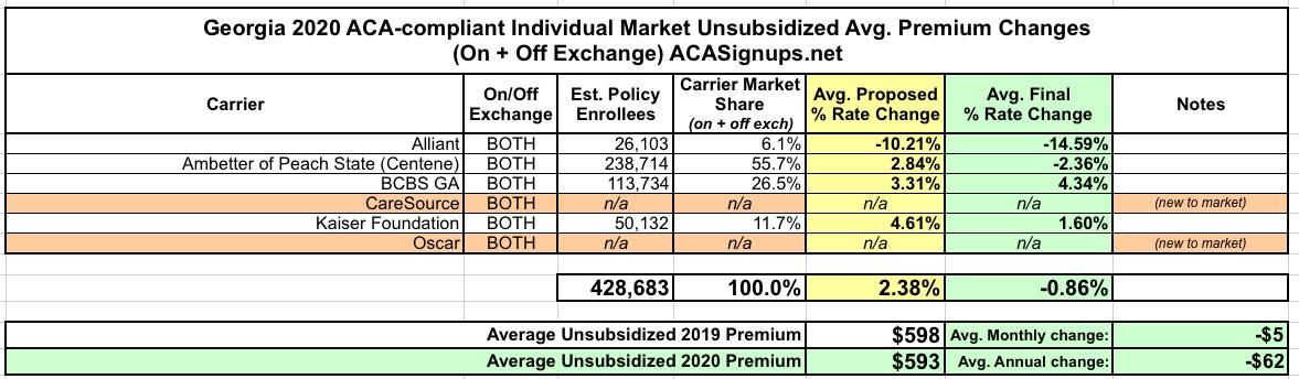 When I ran the numbers for Georgia's preliminary 2020 unsubsidized premium rate changes back in August, they were averaging a 2.4% increase.