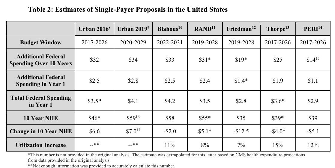 Assuming you rely on the estimates below (which come from Warren's own study), they average around $27 trillion...although if you dismiss the ones starting before 2019 they average $29.3 trillion. Note that Mercatus ("Blahous") appropriately starts their estimate in 2022 since that's the earliest year that a Bernie/Warren M4All bill could even theoretically be implemented, assuming a Sanders/Warren administration took office on January 20, 2021. I'm pretty sure you'd have to nudge the others up a bit to account for normal inflation as well as medical trend to at least an even $30 trillion.