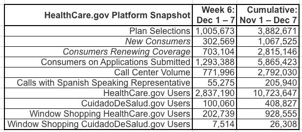 The Week 6 HealthCare.Gov Snapshot Report from CMS should be released sometime Wednesday afternoon, covering enrollment in 38 states from Dec. 1st - 7th.