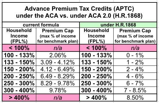 - Second, it makes the underlying formula for the tax credits more generous: Instead of the maximum amount the enrollee has to pay for a benchmark Silver plan ranging from around 2.1% of their income up to around 9.8%, H.R.1868 would drop this down to between 0% - 8.5% of income at the outside.