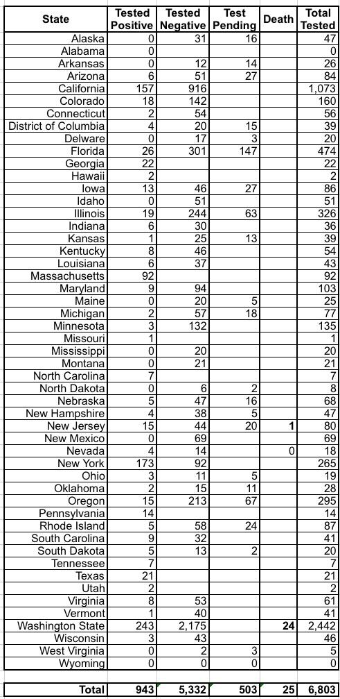 This seems to be the best and really only source of information I’ve seen with detailed and frequently updated data on the rate of COVID-19 testing and infections broken down by states within the United States. This is the breakdown by states. This is the daily cumulative update. In each case you have total tests, positives, negatives and pending. In a better world, the CDC or some other government agency would be publishing this information. But that’s not happening.
