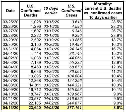 UPDATE 4/13: I've updated the table through tonight, and the mortality vs. 10 days ago continues to drop; it's down to "only" 8.5% now. Projected forward, that suggests around 50,000 of the 587,000 who've tested positive to date will die (26,000 more than the 23,640 who already have). At the same time, the mortality rate vs. today's positive cases continues to inch upwards and now stands at 4.0%. My guess is that the two numbers will continue to converge until they settle in at...what, 5% or so?