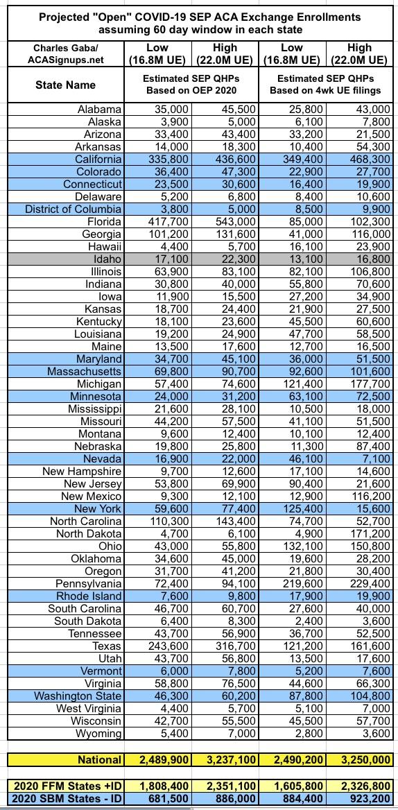 - First: I'm eliminating Idaho entirely. Idaho is the only state-based exchange which has refused to launch a formal COVID-19 SEP to date. However, a few days ago they announced that they're sort of splitting the difference by waiving the documentation / verification process. Instead, they're just asking people to submit a short written explanation of their coverage loss. This isn't the same as an "open" SEP (you still have to have recently lost coverage; you're not eligibile if you haven't had a Qualifying Life Event), but it's better than forcing people to hunt down and submit documentation which may be difficult or impossible to acquire.