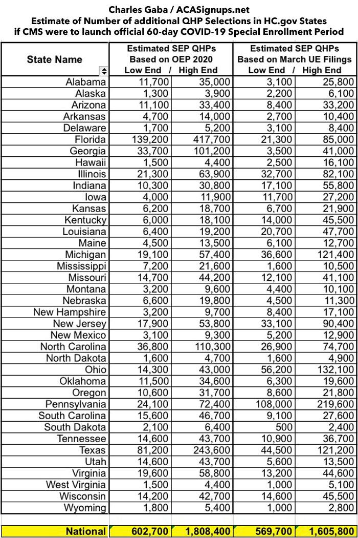 Yesterday I ran an exclusive analysis based on existing COVID-19 Special Enrollment Period (SEP) data to figure out a) roughly how many Americans are likely to enroll in ACA exchange coverage using this SEP in the twelve states offering one, and b) how many additional Americans would likely #GetCovered via ACA exchange policies in the other 39 states which don't currently have a CV19 SEP in place.