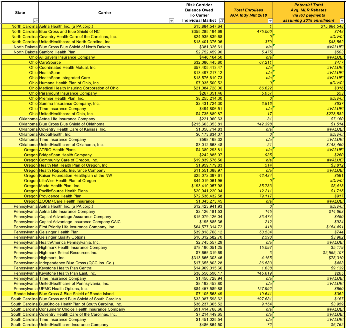 (At the opposite end of the spectrum, as I mentioned earlier, is CareFirst BlueChoice of DC, which is only owed $15,000...and they had 4,400 enrollees in 2018, which means that assuming a similar enrollment this year, each one would likely only receive $3....spread out over 3 years. Enjoy that $1/year, folks!)