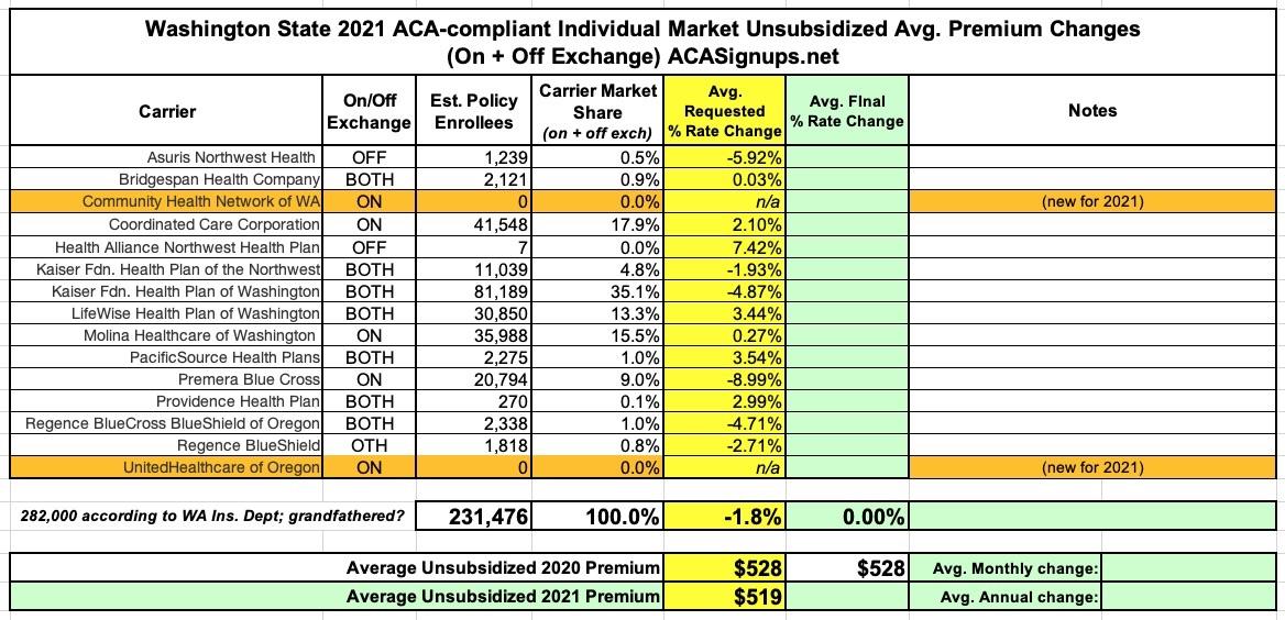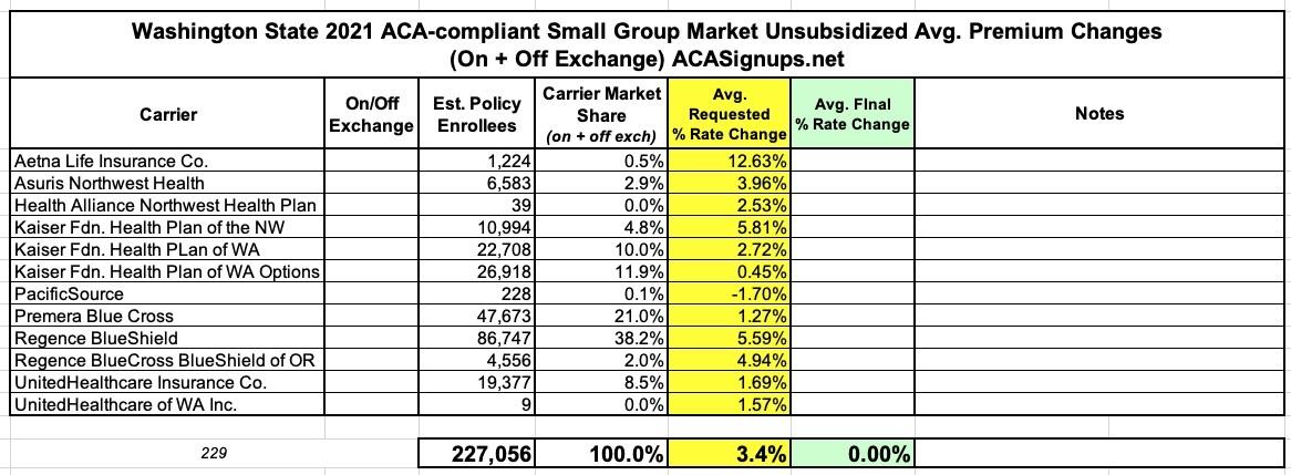 Washington State: Preliminary avg. 2021 #ACA premiums: 1.8% reduction; sm. group up 3.4%
