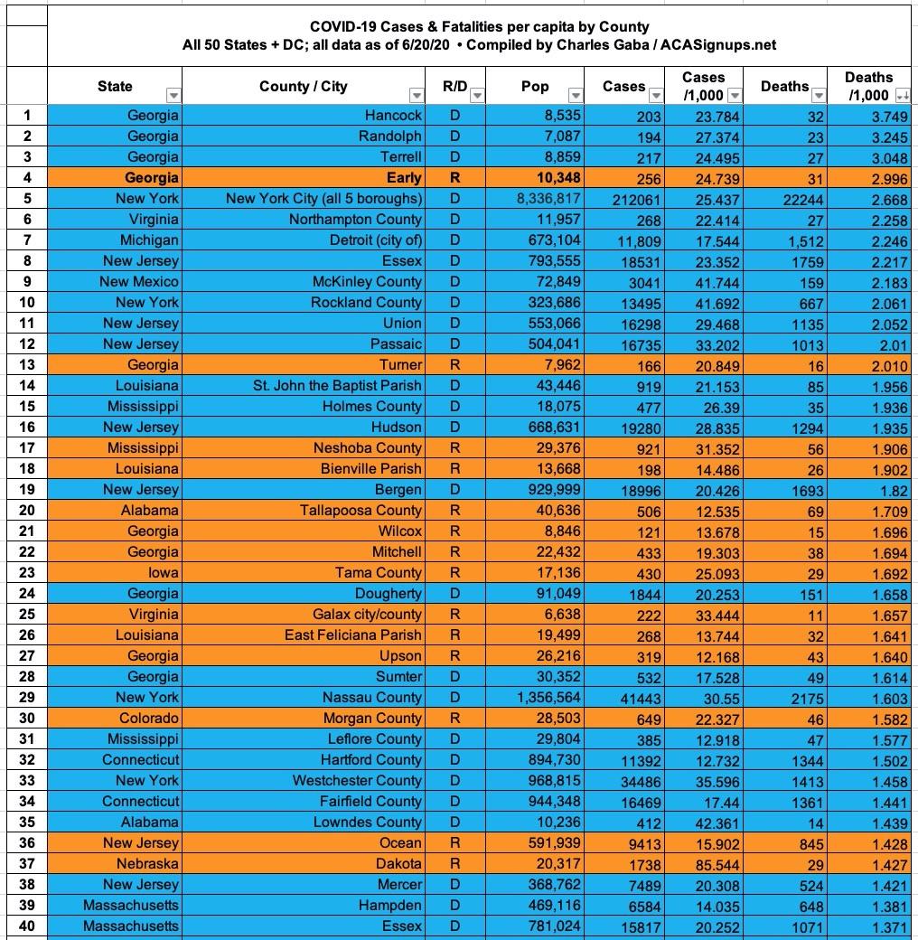 Here's the top 40 counties ranked by per capita COVID-19 fatalities as of Sunday, June 20th: