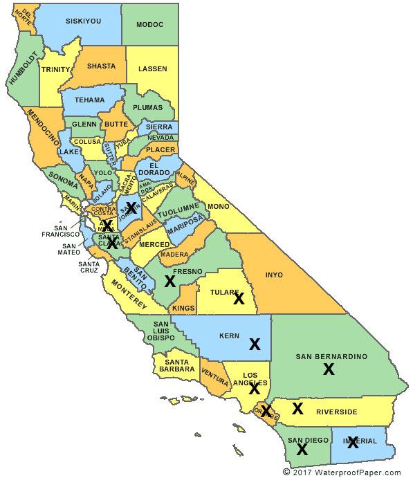 OK, so what's going on in Imperial County, California? Well, here's a map of California with all 12 counties marked. Five of them are in central CA, the other 7 are in the southern third of the state. And Imperial County is right at the very bottom (next to San Diego...except that San Diego is actually the third from the bottom on the per capita graph above):