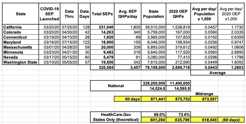 As an aside, this brings the total number of confirmed COVID-19-specific SEP enrollments up to at least 320,000 across the 8 state exchanges which offered one and have released their COVID SEP enrollment data: