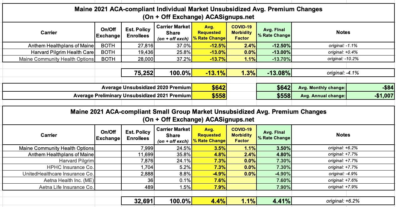 Back in late June, I noted that the Maine Insurance Dept. had issued the preliminary 2021 rate filings for the state's individual and small group market carriers. At the time, the individual market carriers were averaging rate reductions of around 4% while the small group carriers were looking to raise premiums by around 6.2%.