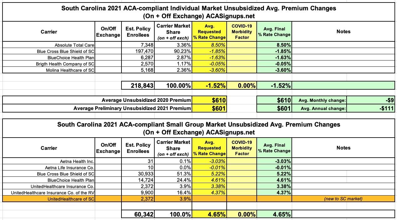 The South Carolina Insurance Dept. released their final/approved 2021 Individual and Small Group Market premium rate changes.
