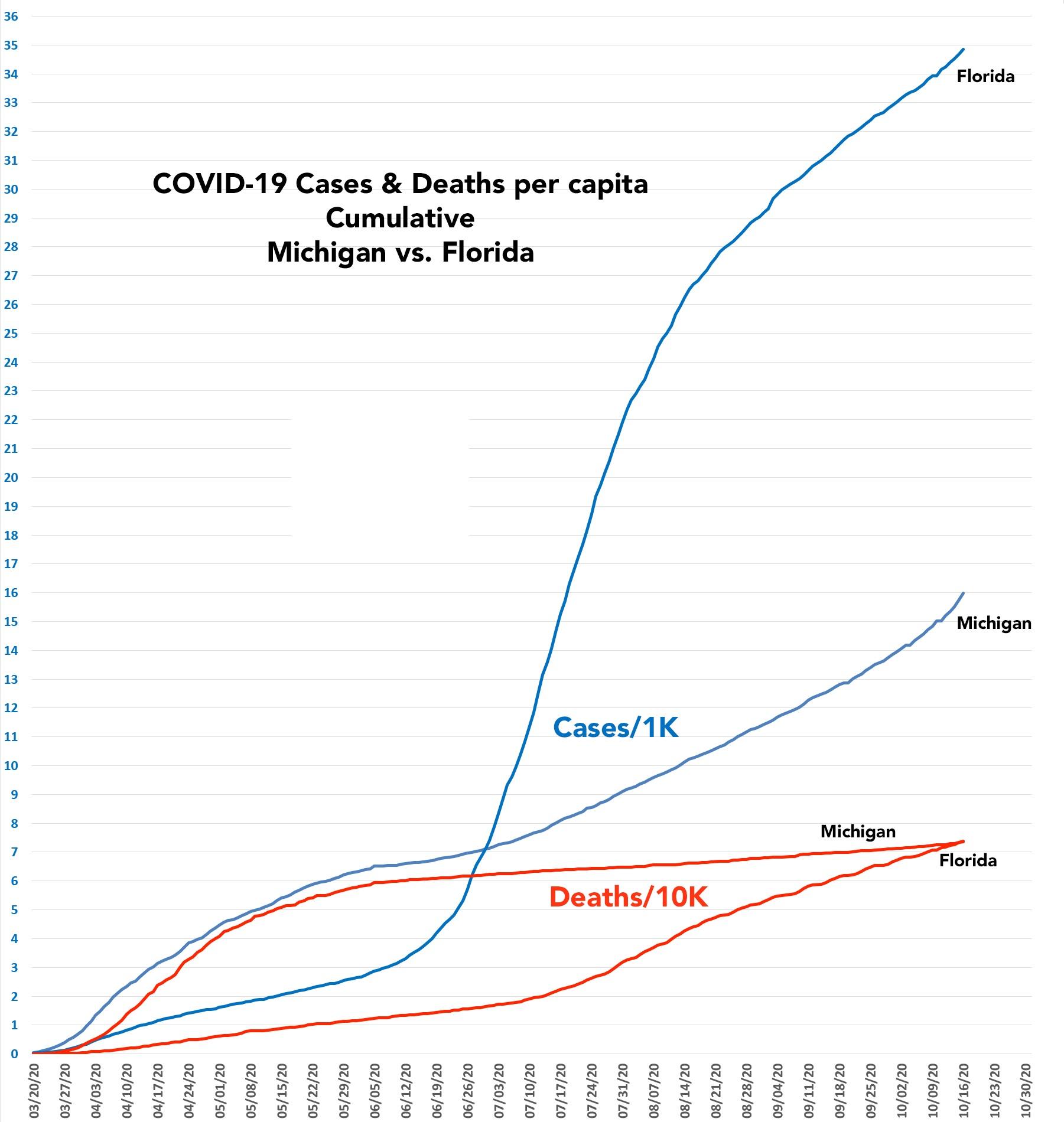 Here's a graph of official COVID-19 positive test cases and fatalities per capita for both Michigan and Florida. Cases are per 1,000 residents; deaths are per 10,000 in order to make the trendlines more visible: