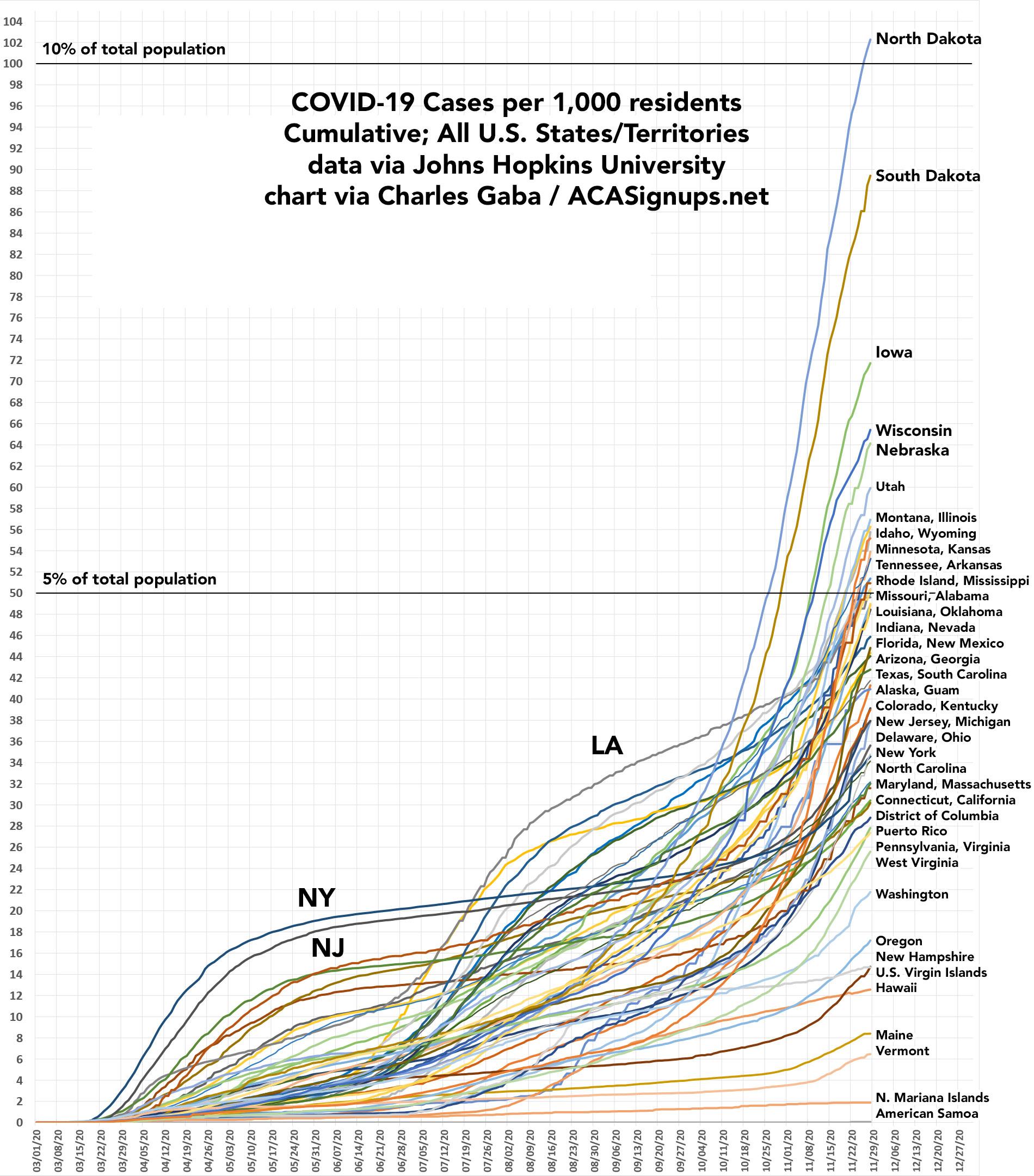 North Dakota recently became the first state to cross the 10% infection threshold, with South Dakota not far behind. Iowa, Wisconsin, Nebraska and Utah could all potentially hit the 10% milestone by New Year's Eve as well.