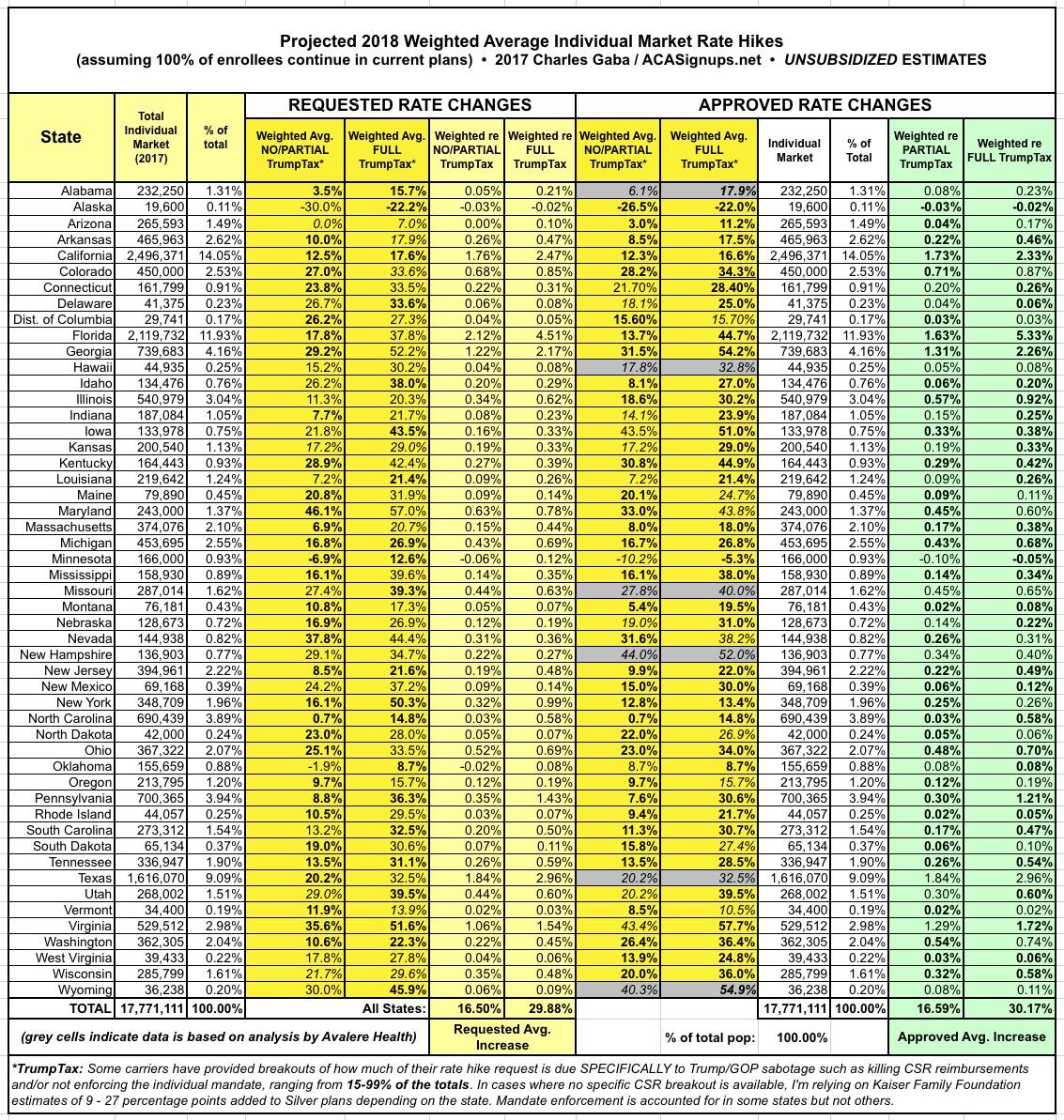 UPDATE 6/02/17: OK, between North Carolina (60% due specifically to sabotage) and Pennsylvania (75% due specifically to sabotage), I'm bumping my ballpark average assumption up to a flat 50% due to the "Trump Uncertainty Tax" in states which don't otherwise specify the impact. I've also added new columns to the tables below which compare the total rate hike requests vs. what they likely would be without the Trump Tax included.