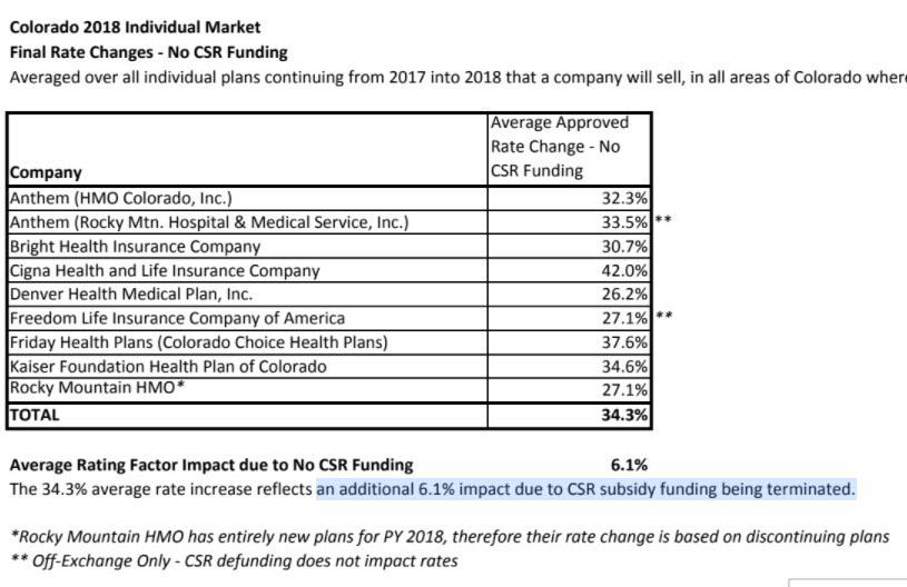 I've been assuming a ballpark average of 40% being due to general Trump/GOP/CSR uncertainty as a general rule of thumb. I'm sure it ranges widely from carrier to carrier, and I don't expect many other carriers to be quite so candid and specific about this issue, but BCBSNC has over half a million enrollees on the individual market (on + off exchange). That's 2.8% of the entire indy market all by themselves. Food for thought.