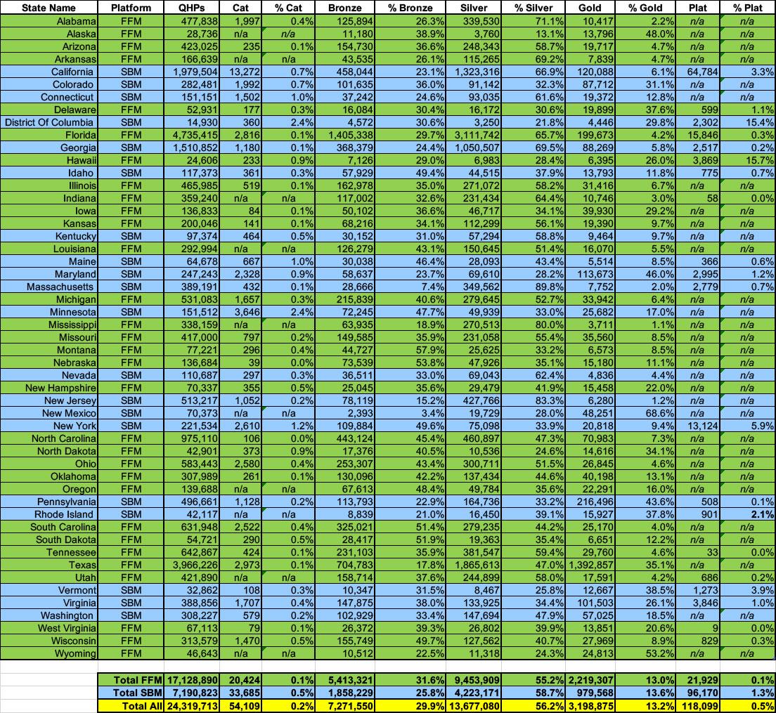 If you've ever wondered why healthcare wonks (myself included) almost never even bring up the ACA's Catastrophic Level plans and why the only time I ever discuss Platinum Plans is in the context of high-CSR enrollees being eligible for "Secret Platinum" plans (labeled as Silver), this table should explain why.