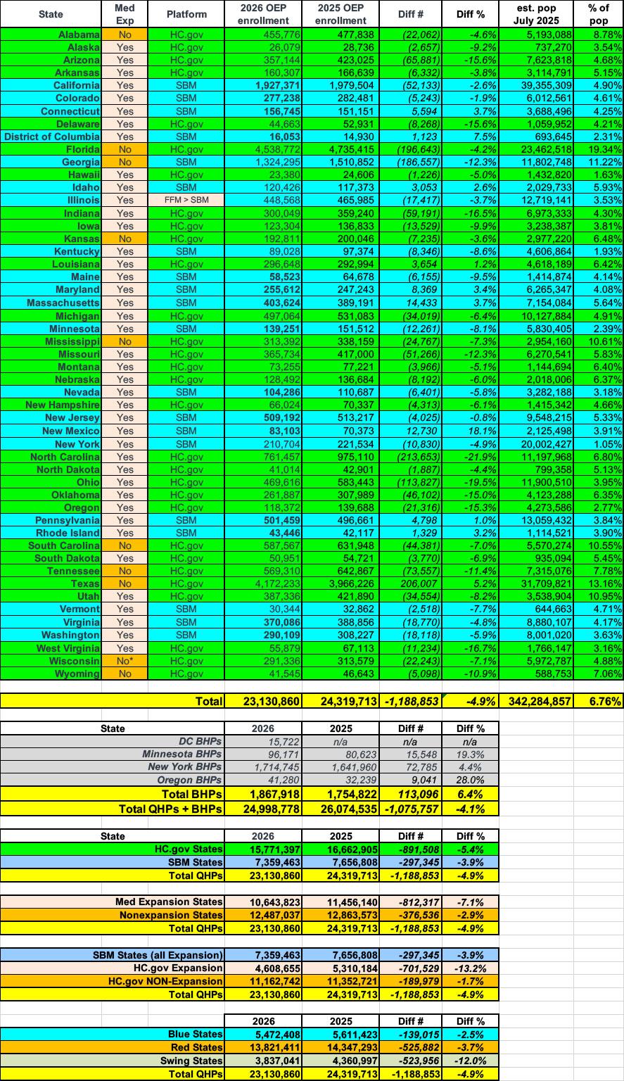 EXCLUSIVE! FINAL 2026 Open Enrollment Report published: 23.1M QHP selections; 25.0M w/BHPs, down 1.2M y/y (Part 1)