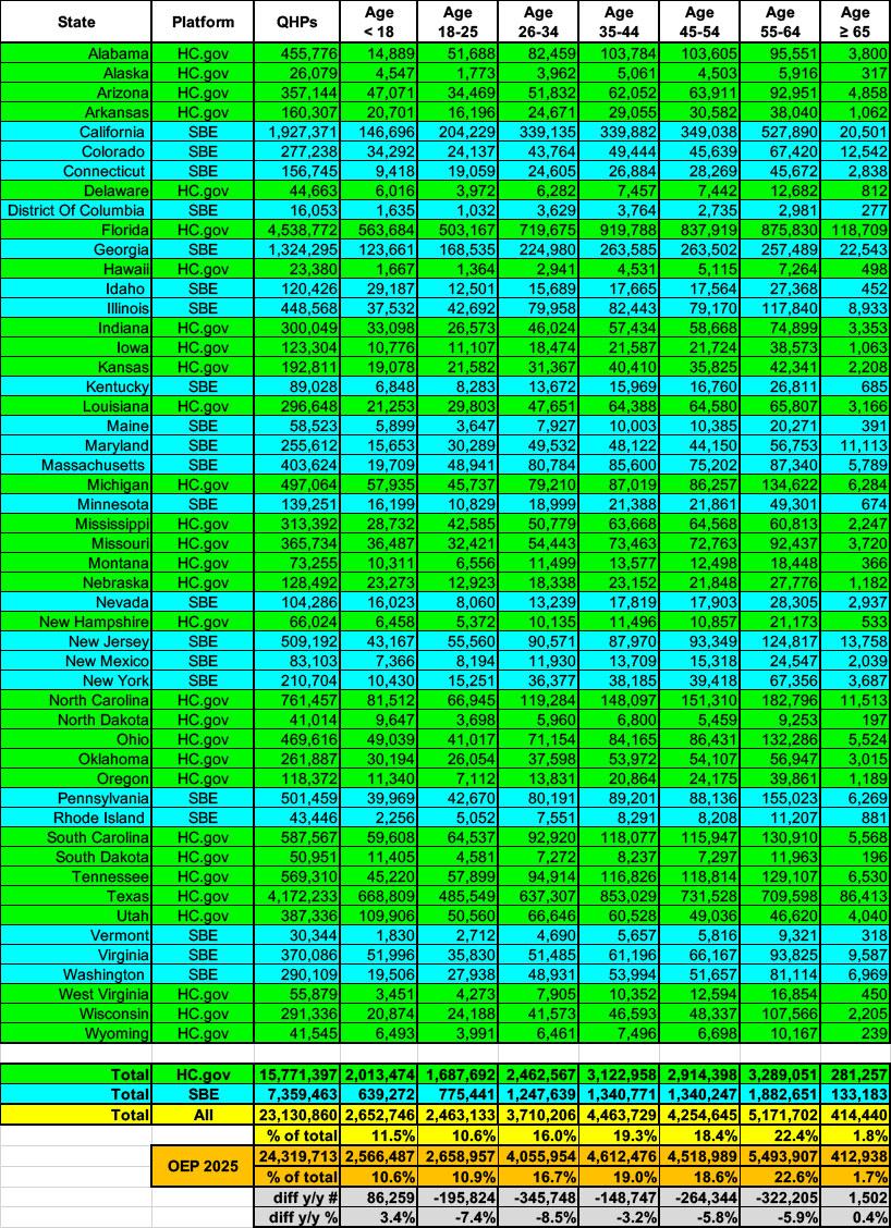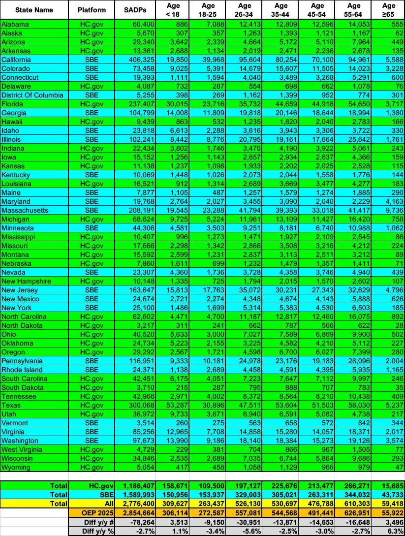 - As expected given the subsidy expiration, enrollment among young adults plummeted (down 7.4% & 8.5% among 18-25 yr olds & 26 - 34 yr olds respectively). This will absolutely have a disproportionate negative impact on the risk pool (and, thus, gross premiums) next year
