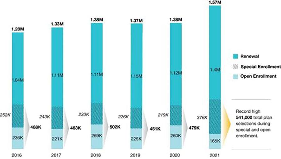 [1] Special Enrollment” is a subset of the renewal population. For example, of the 1.4 million renewing consumers for 2021, 376,000 had newly signed up during the special-enrollment period during 2020.